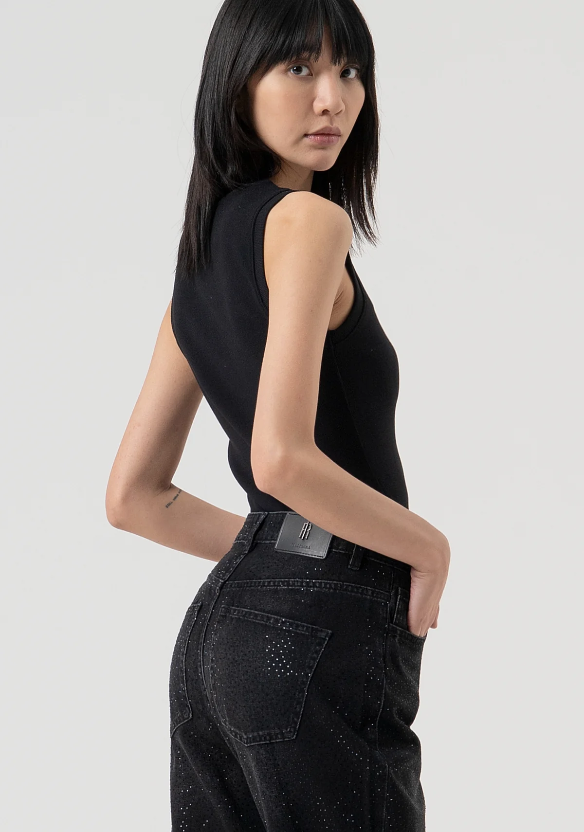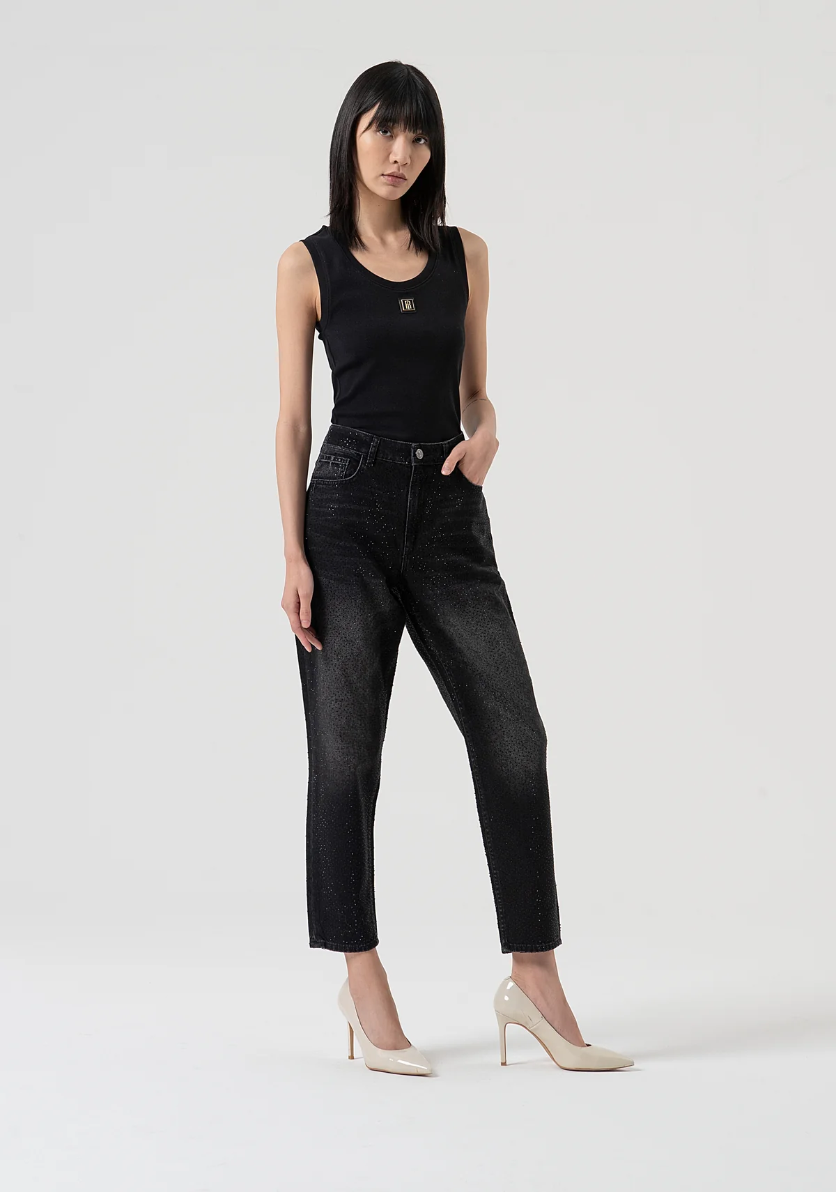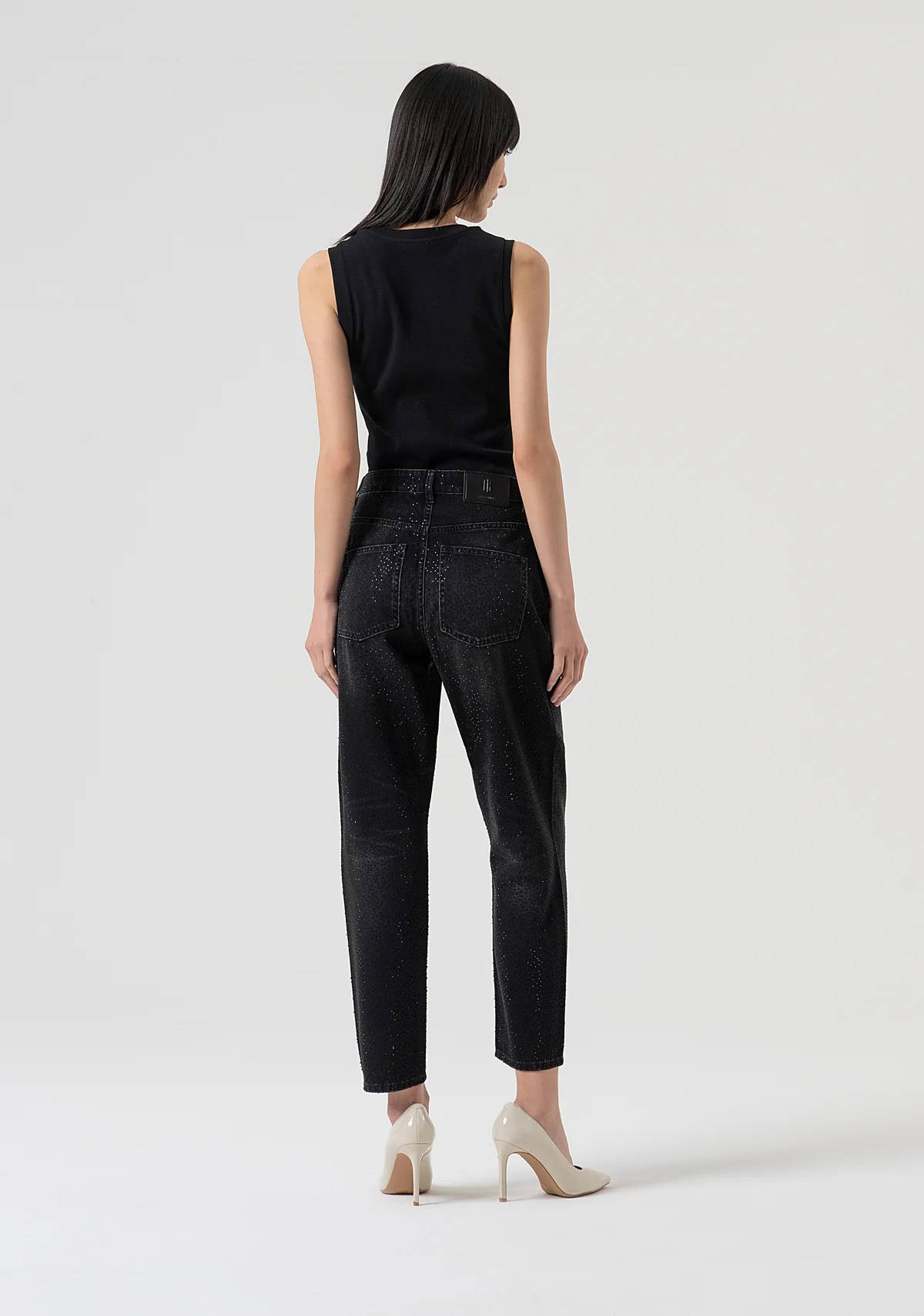 jeans carrot mom fit confeccionados en denim negro con lavado oscuro